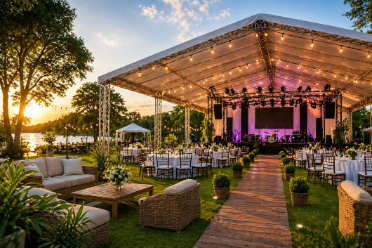 Evento ao ar livre com tenda estruturada, palco, mesas e iluminação profissional montados em área externa
